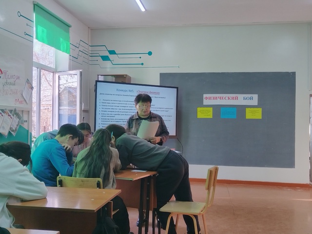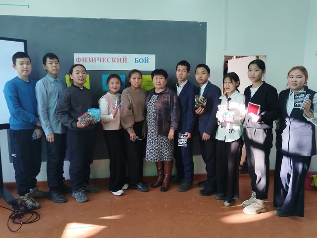 — в 8-ых классах учитель Санчай Р. О провела «Физический бой», конкурс состоялся из 6 туров, в том числе были туры среди капитанов команд и болельщиков. В результате победителями физических схваток стали команда 8 б класса (капитан команды Монгуш Агым), уступив немного баллов вторыми стали команда 8а класса (капитан команды Монгуш Буян).