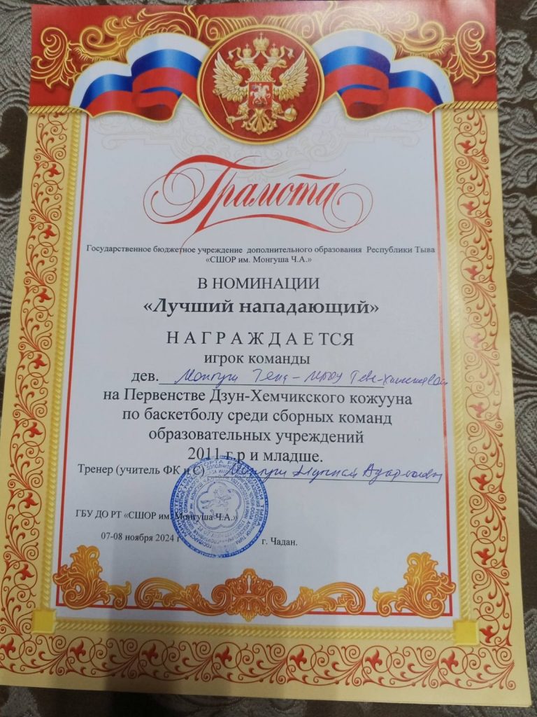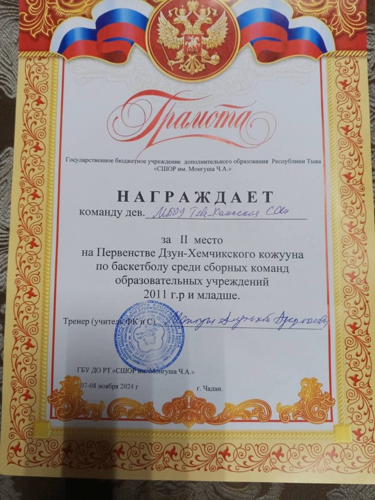 11.11.2024 / На Первенстве Дзун-Хемчикского кожууна по баскетболу среди сборных команд образовательных учреждений наша сборная команда заняли 2 место.Ученица 7 класса Монгуш Тяна стала «Лучшей нападающей команды»Тренер: Монгуш Алтынай Адар-ооловна