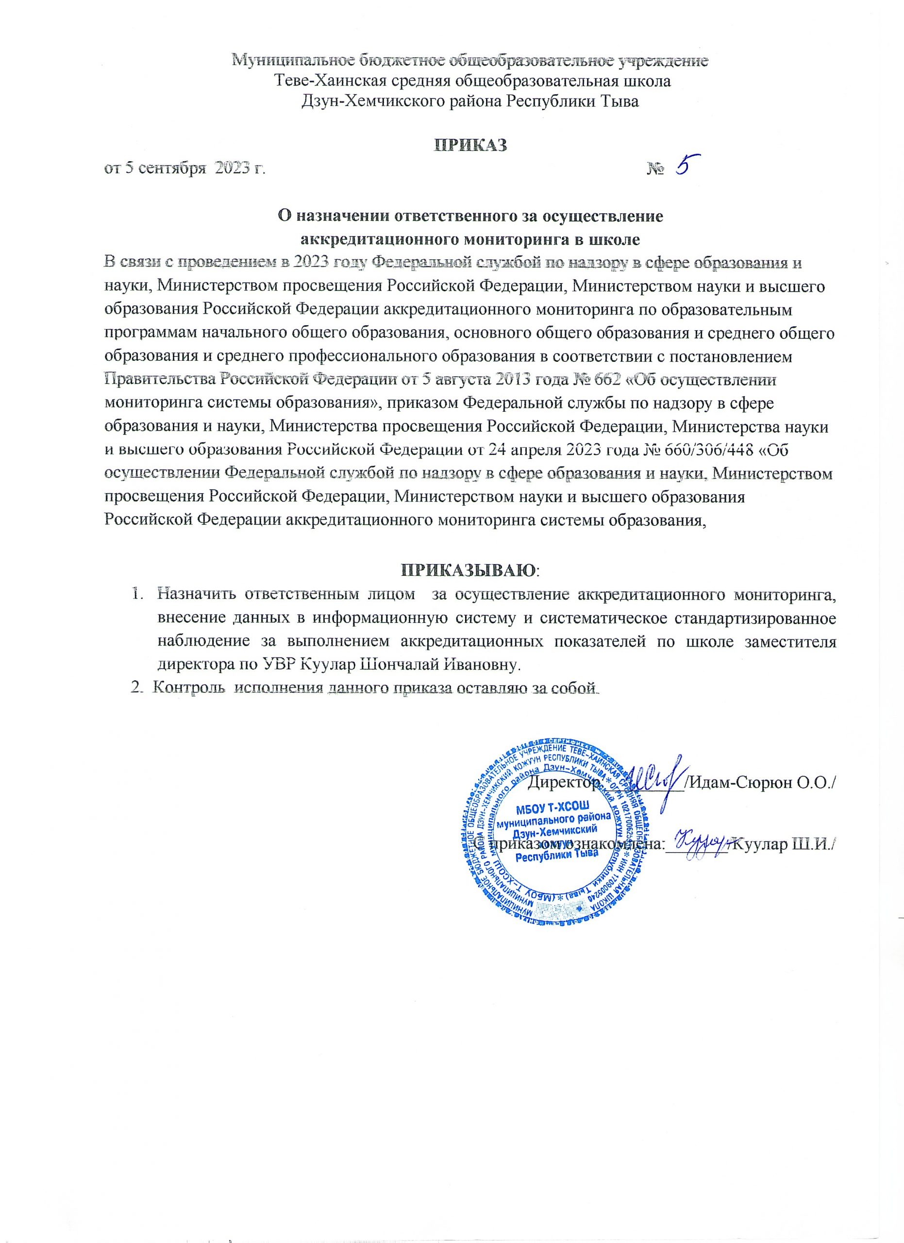 ПРИКАЗ № 5 от 05 сентября 2023 г. «О назначении ответственного за осуществление аккредитационного мониторинга в школе»Скачать