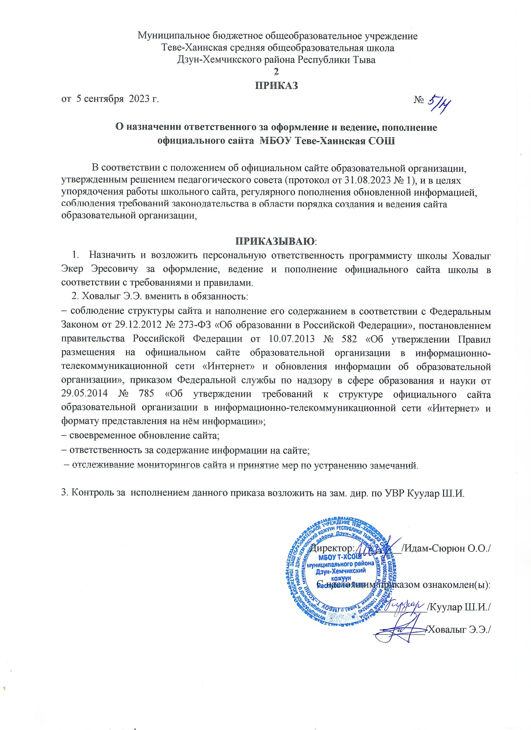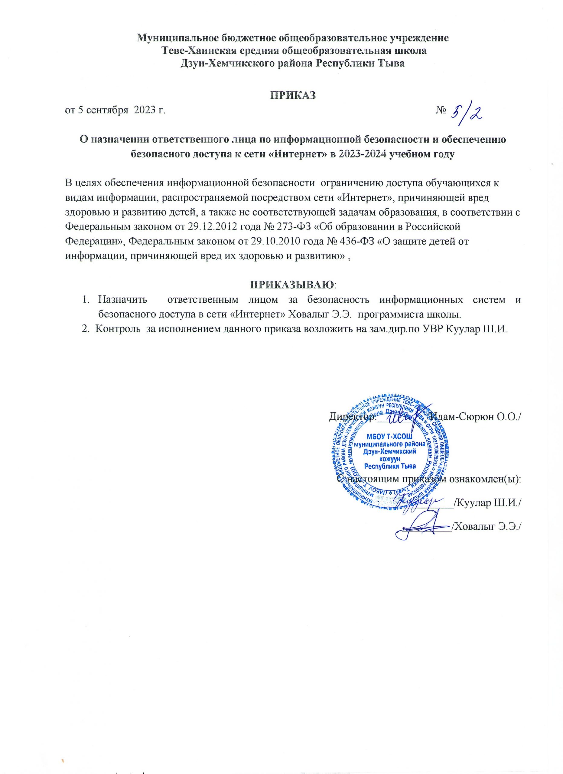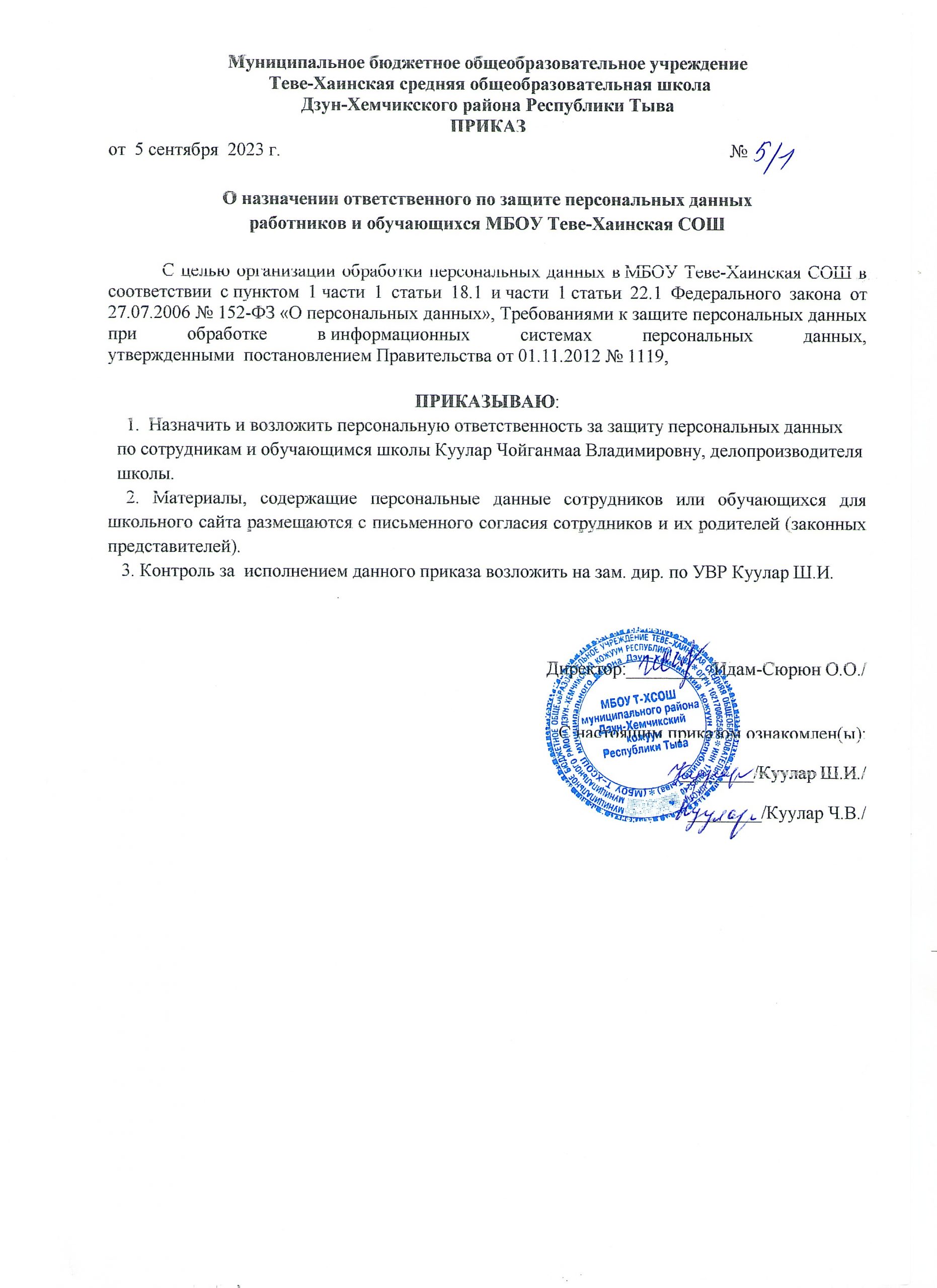 ПРИКАЗ № 5/1 от 05 сентября 2023 г. «О назначении ответственного по защите персональных данных работников и обучающихся МБОУ Теве-Хаинская СОШ»Скачать