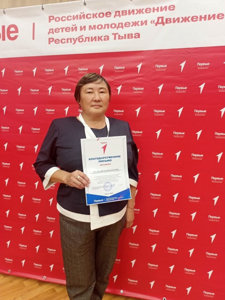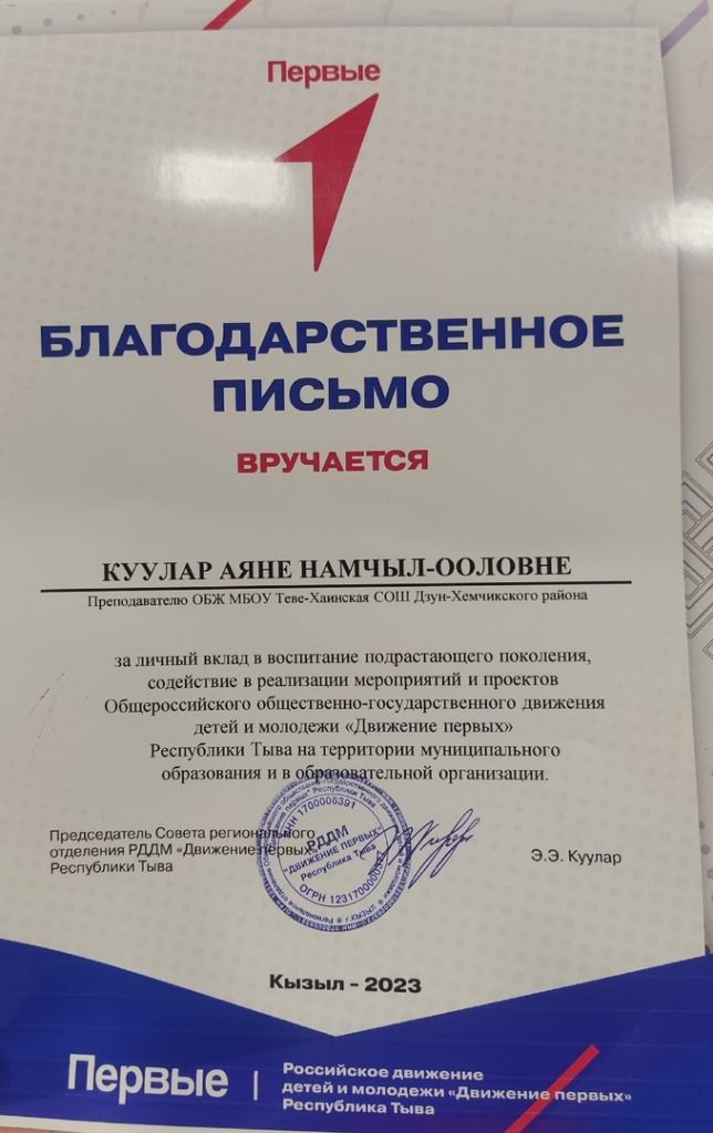 Наши педагоги тоже были отмечены. Благодарственные письма вручены Монгуш Ирине Шериг-ооловне — старшему вожатому МБОУ Шеминской СОШ, Монгуш Айдыс Донгур-ооловне — старшей вожатой МБОУ СОШ № 4 имени Байлак Вера Чульдумовны г. Чадан, Куулар Аяне Намчыл-ооловне — преподавателю ОБЖ МБОУ Теве-Хаинской СОШ, Кара-Сал Алдын-Белек Допайовичу — старшему вожатому МБОУ СОШ № 1 г. Чадан.#ДвижениеПервых